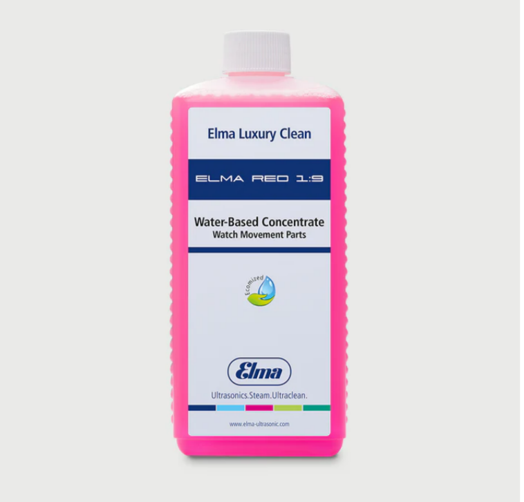 ELMA RED 1:9 - это высокоэффективный жидкий чистящий концентрат для очистки разобранных часов и прецизионных металлических деталей водой, специально разработанный для машин для чистки часов.